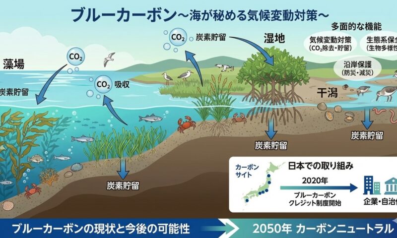 2050年のカーボンニュートラル実現に向けて、海洋生態系の自然の仕組みを活用した「ブルーカーボン」が新たな炭素吸収源として注目されています。四方を海に囲まれた日本は、藻場や湿地、干潟も多く、ブルーカーボンの潜在力が大きい国だと言えます。ブルーカーボンは、気候変動対策(炭素の除去・貯留)に加えて、生態系の保全や沿岸の保護など、多面的な機能をもつことも大きな意味を持ちます。国内では2020年にブルーカーボンクレジット制度が始まり、企業や自治体の取り組みも活発になってきました。本コラムでは、ブルーカーボンの現状と今後の可能性について解説します。